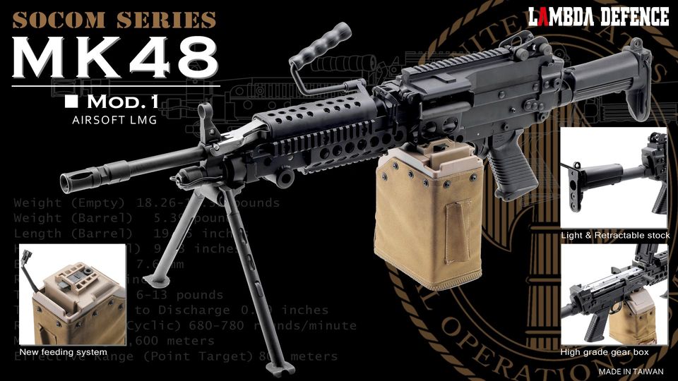 Overall length: 970 mm Weight: 12kg Caliber: 6 mm Barrel: 430 mm Drum Magazine capacity: 5000 rounds Energy: 1 ~ 1.4 J Velocity: 90 - 140 m/s (360 ~ 500 fps)